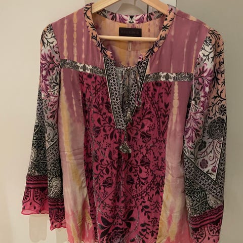 Hale Bob bluse for dame i størrelse S. Blusen er laget i chiffon og har et flerfarget mønster med ulike ornamentale trykk. Modellen har lange ermer, rund hals med liten åpning foran og lett buet fald nederst. Stoffet er tynt og lett gjennomsiktig, typisk for chiffon. Passer som en lett overdel til hverdagsbruk eller mer pyntede anledninger, eventuelt med topp under etter ønske.