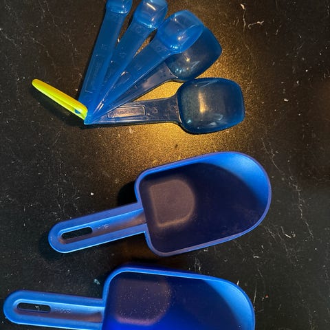 Tupperware kjøkkenutstyr i plast. Settet inneholder blant annet måleskjeer, serveringsbestikk, små beholdere med lokk, en shaker/kopp med lokk og innsats, samt en manuell hakker med knivinnsats og lokk. Flere deler i ulike blåtoner og noen i transparente farger. Egnet til matlaging, oppbevaring og servering på kjøkkenet.