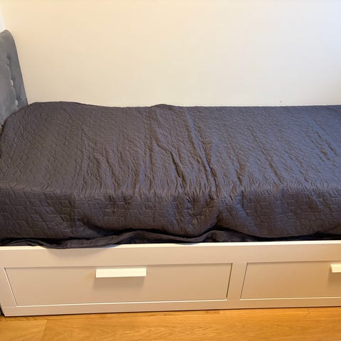 IKEA Brimnes dagseng med skuffer i svart utførelse. Sengen har ribbebunn i tre og to romslige skuffer under liggeflaten som kan brukes til oppbevaring av sengetøy eller annet. Egner seg som enkeltseng til daglig, og kan trekkes ut til til dobbeltseng, ved behov.Designet gjør at sengen kan plasseres inntil vegg og fungere både som sofa på dagtid og seng om natten.