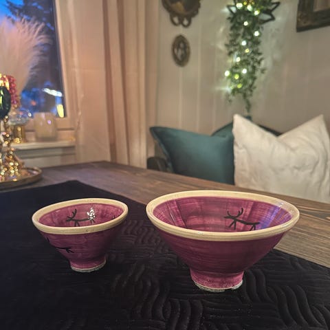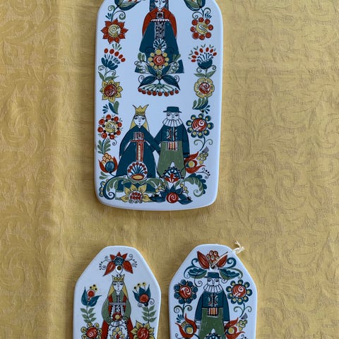Vakker håndmalt glasur og fine detaljer med dybde i relieffet. Trolig produsert i Norge på 1950–60-tallet. Svært dekorative og tidsriktige – passer perfekt på hytte, i entre eller i et retro-/vintageinteriør.