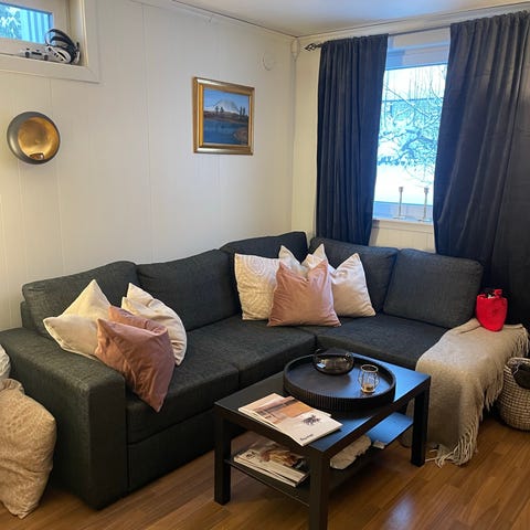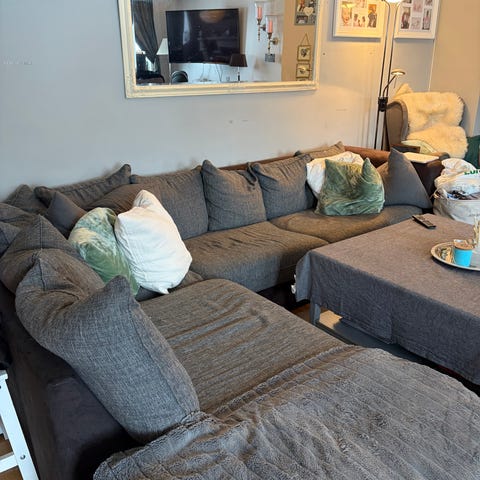 Glidlås ødelagt på hjørnepute, kan fikses, men syntes ikke når putene ligger på plass. Ingen synlige skader ellers. Sofaen har en dybde på 100 cm