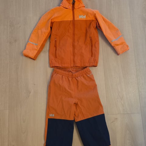 Didriksons regnsett for barn/unisex i størrelse 140. Sett med jakke og bukse i flerfarget nylon og bomull hovedsakelig oransje og turkis med kontrastfelt. Jakken har hette, glidelås foran og refleksdetaljer på ermer og nederkant. Buksen har strikk i livet, forsterkede felt på knær og nederkant, samt fotstrikker. Egnet som yttertøy i vått vær for barn rundt størrelse 140.