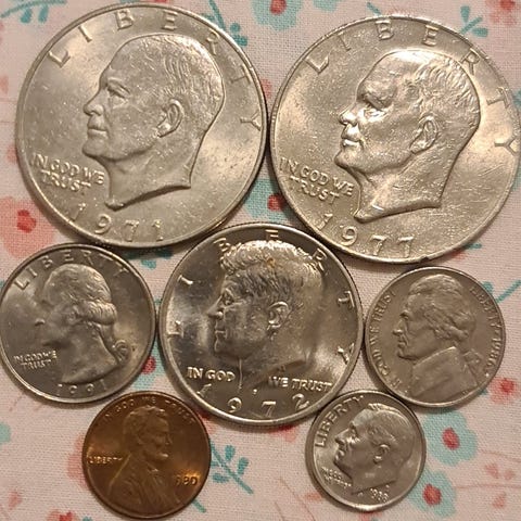 USA mynter kvartdollar, femcent og tikroning sølvfarget