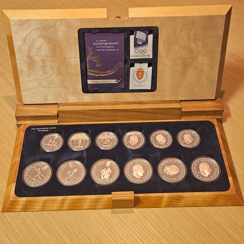 Lagt sammen og omregnet til 99,9% sølv så blir det 626,21 gram / 20,13 Troy ounce. Selger settet til spotpris, pr 02.03.26 en spotverdi på kroner 18.500,- (920,-/oz).
