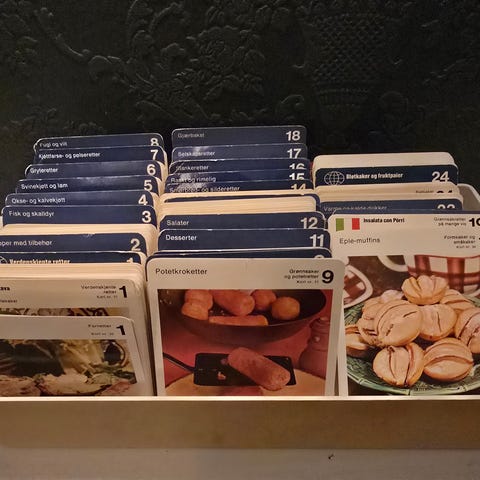 Selger en boks med MATOPPSKRIFTER i forskjellige kategorier.