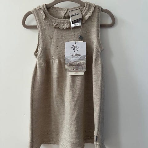Lillelam skjørt i ull til jente. Skjørtet er i størrelse 80 og har en lys rosa farge. Det er strikket i ull med hullmønster og lett utsvinget fasong. Elastisk linning i livet gir god passform. Pent brukt og uten anmerkninger.
