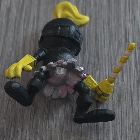 Bildet viser en eldre plastfigur, sannsynligvis en samlefigur eller en leke fra et barnemåltid: