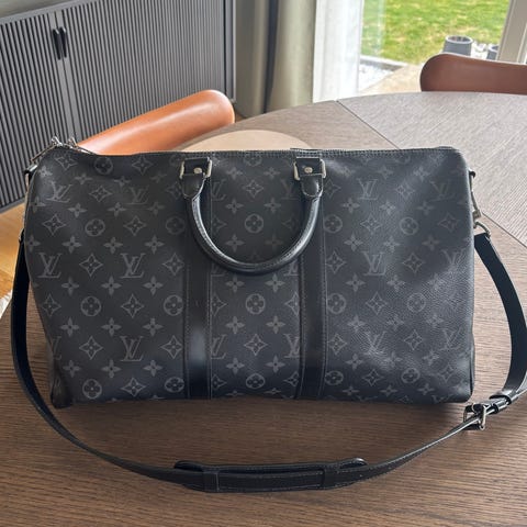 Selger en Louis Vuitton Keepall Bandoulière 45 Monogram Eclipse kjøpt i 2017. Klassisk og tidløs modell i svart/grå Monogram Eclipse canvas – perfekt som weekendbag eller carry-on. Komplett sett!