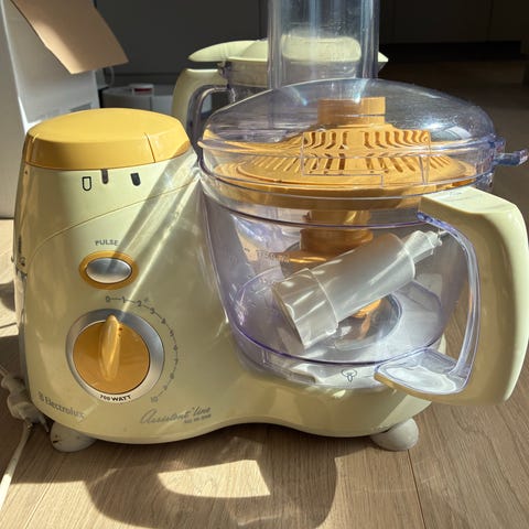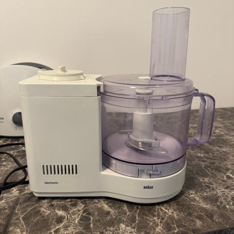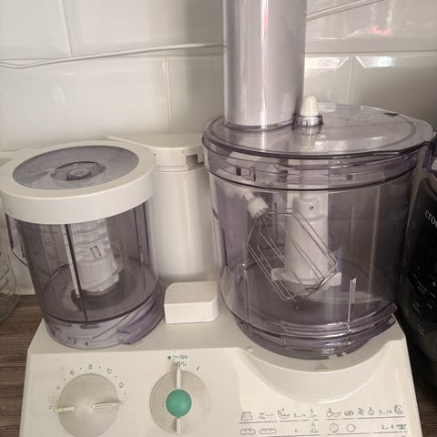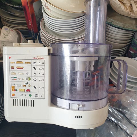 Pent brukt Braun kjøkkenmaskin med transparent bolle og knivblad i metall. Maskinen har plastkropp og kommer med ekstra tilbehør som visp/røreverktøy. Egnet til hakking, røring og enkel matforberedelse på kjøkkenet. Typer 4258