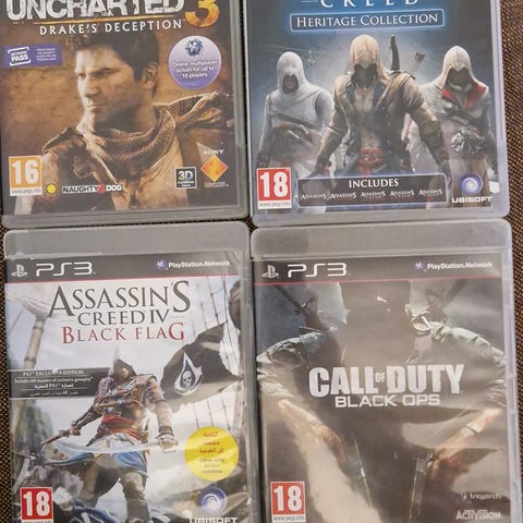 Sony Playstation 3 spill Uncharted: Drake’s Fortune og Uncharted 2: Among Thieves. Begge er action‑eventyrspill utviklet for Playstation 3-plattformen. Spillene følger karakteren Nathan Drake i historiebaserte eventyr med fokus på utforskning, plattformsekvenser og kamp. Leveres som fysiske Blu-ray-disker i original PS3-eske med omslagstekst og aldersmerking trykt på coveret.