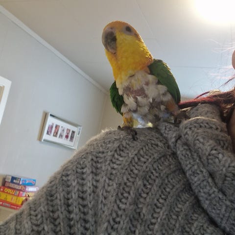 Vi selger en nydelig Caique på snart 5 år. Kjønnet er ukjent, men personligheten er det ingenting å si på! Denne fargerike og livlige papegøyen er tam, seletrent, og vant med både barn og hunder.