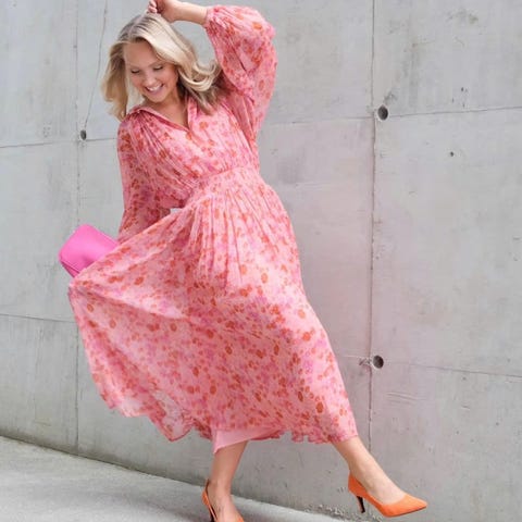 Splitterne Ganni sommerkjole for dame i størrelse 32, men den passer meg fint som bruker både størrelse 34 og 36 (XS og S). Kjolen er laget i viskose og har et flerfarget blomstermønster på lys bunn. Modellen har V-utringning, lange ermer med knapper ved mansjettene og avtagbart knytebelte i livet. Lengden er ankellang/midilengde, og passformen er rett med lett vidde i skjørtet. Egnet til bruk vår og sommer, både til hverdags og enklere anledninger.