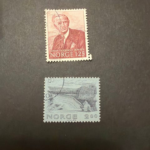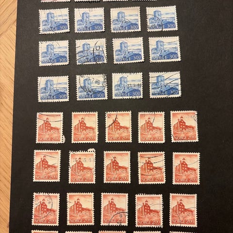 Lot med norske frimerker med ulike motiv. Motivene omfatter blant annet «Telefonen i Norge 100 år» med parabolantenne, arkitektoniske byggverk i blått motiv, et motiv med mennesker og tekst «Funksjonshemmedes internasjonale år 1981», samt et motiv med rytter på hest foran borg. Frimerkene har ulike pålydende verdier (blant annet 1,25, 1,50, 1,10 og 2,20) og er stemplet. Egner seg som samlerobjekter for norske frimerker med tematiske motiver.
