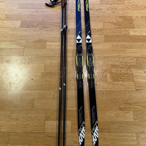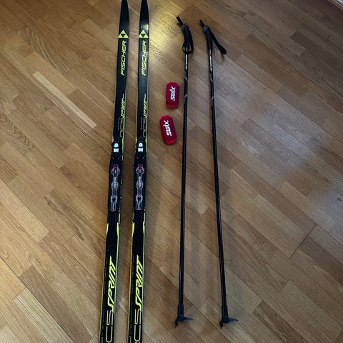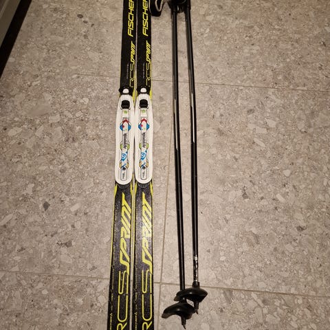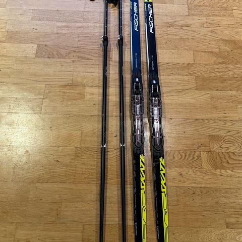 Fischer SCS Skate langrennski med tilhørende bindinger og staver.