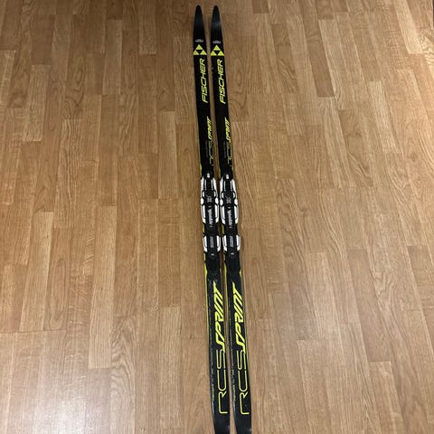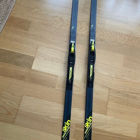Fischer SRC skøyteski med tilhørende staver i svart og gult. Skiene har kompatible bindinger montert. Stavene har justerbare håndstropper og trinser tilpasset skøyting. Passer til trening og turbruk i preparerte løyper.