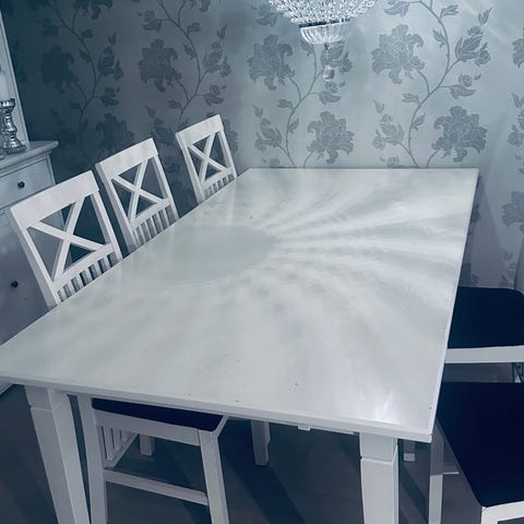 Følger med syv hvite stoler. Må hentes fort som mulig, helst inne kl 12 søndag pga flytting og utvask.