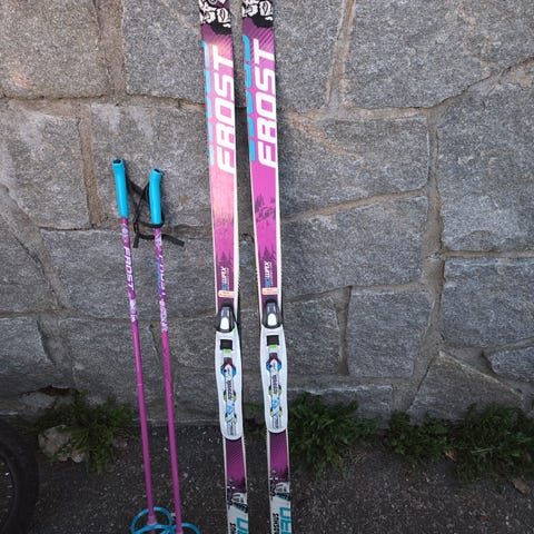 Skiene er brukt, men i god stand. Normale bruksmerker på oversiden (se bilder). Sålen er hel og fin.