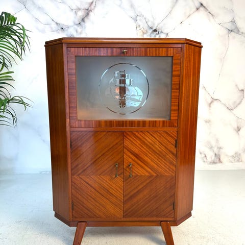 Skjenken er nyoljet, LED montert, og trykk-knappene fungerer perfekt. Fremstår som nesten ny!