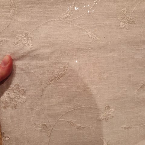 IKEA gardiner med blomstertrykk i kremhvit farge. Gardinen har et lett, transparent stoff med mønster av blomster og blader. Øverst er det påsydd gardinbånd for oppheng på skinne eller med kroker. Passer til stue, soverom eller andre rom der man ønsker å skjerme innsyn samtidig som noe lys slipper gjennom.