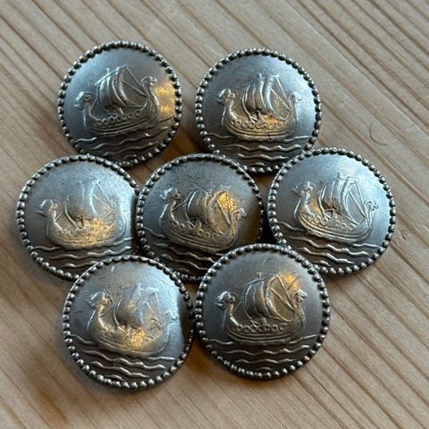 Rund brosje med motiv av landskap og fugler. Forsiden har dekor i perlemor kombinert med metall. Brosjen festes med nål på baksiden og kan brukes på jakker, gensere eller skjerf som et dekorativt smykke.