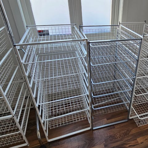- 2 grå trådkurvstativ med høyde 105 cm, bredde 43,6 cm og dybde 49 cm. Det finnes rest av noe maling på enkelte av sidene på disse. Selges for kr 150,- pr. stk.