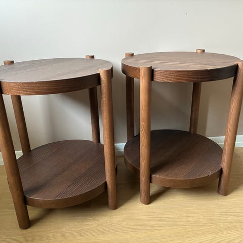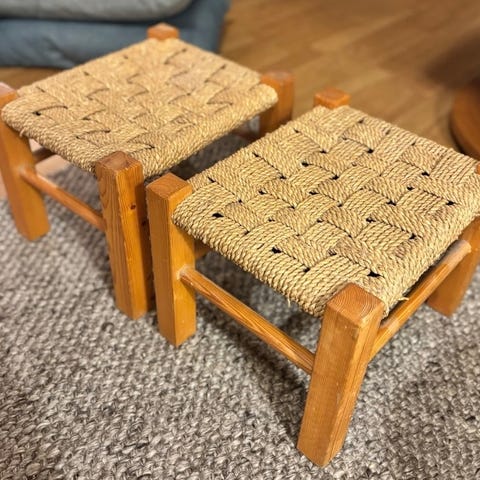 2 stk stilige krakker i lyst tre med flettet sittedel.