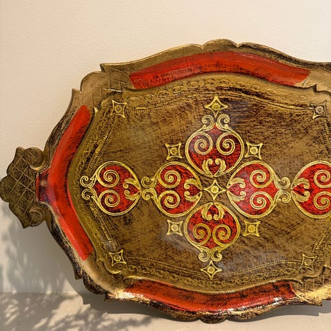 Rosemalt rektangulært serveringsbrett rødmalt metalll