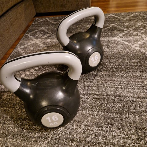 Kettlebell manual treningsvekt i to farger, gul og grønn, 16 og 24 kg.