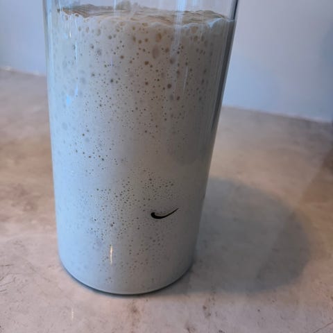 Du får ca. 100–150 g aktiv starter, klar til bruk eller videre mating.