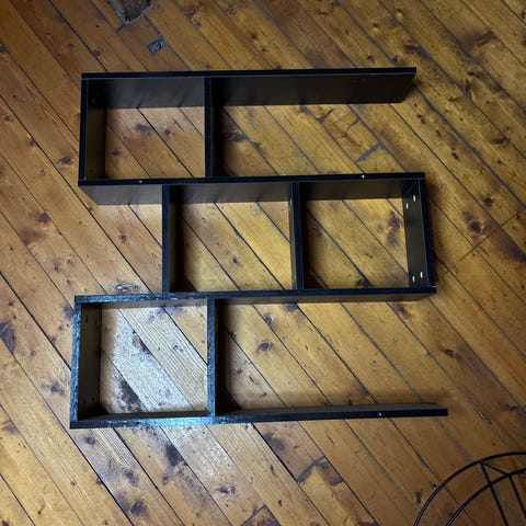 Boks hyller selges. De har hengt høyt på en vegg i noen år og er derfor ikke synlig brukt. Hyllen lengst til venstre på bildet (hvit) har fått noe som ser ut som isolasjonsskum på seg. Se bildet