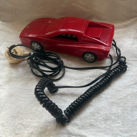Bilformet fasttelefon i svart plast. Telefonen er utformet som en klassisk bilmodell med detaljer som hjul og karosseri. Tastaturet er plassert på innsiden når bilen åpnes. Passer som fasttelefon der slik tilkobling fortsatt er tilgjengelig, eller som dekorativ gjenstand eller samleobjekt.