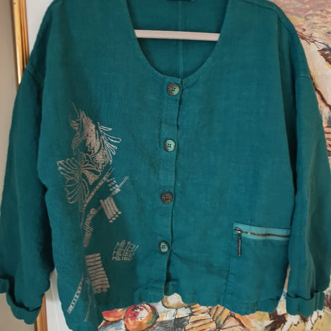 Nydelig klar blå jakke i 100 prosent viskose. Laget i Danmark, for merket Milieu. Passer godt over en kjole eller som selvstendig jakke.