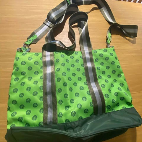 Verken i kunstlær for dame. Vesken er grønn med gule prikker, rosa skulderreim og detaljer, samt kontrastkant i lysere grønn. Den har ett hovedrom med glidelås, innvendig glidelåslomme og en utvendig lomme med klaff. Egnet som hverdagsveske eller liten weekend-/treningsbag. Ukjent merke.