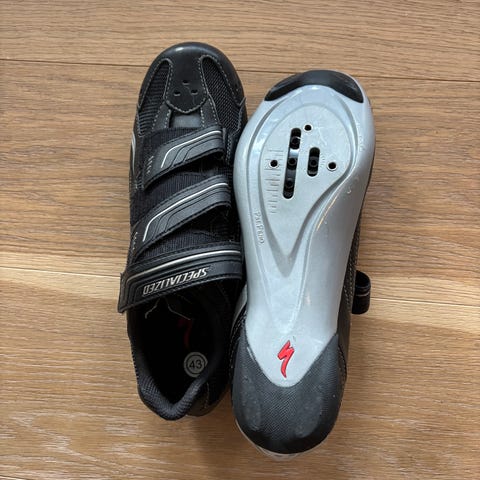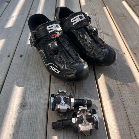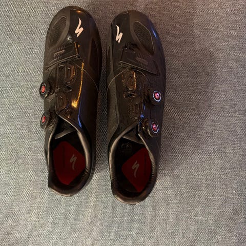 Specialized S-Works sykkelsko for landevei i størrelse 45. Skoene har overdel i syntetisk materiale med svart hovedfarge og røde detaljer. Lukkesystem med flere justerbare strammehjul og vaier for presis tilpasning. Stiv såle tilpasset landeveispedaler med tre-bolts feste. Leveres sammen med røde Look landeveispedaler slik de vises på bildene.