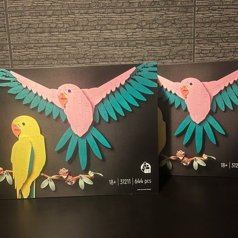 Papegøyer byggesett. Uåpnet. Sett for å bygge veggdekorasjon med to papegøyer i ulike farger. Motivene kan henges opp på vegg eller stilles ut på hylle som dekor. Egnet som byggeprosjekt for 18+
