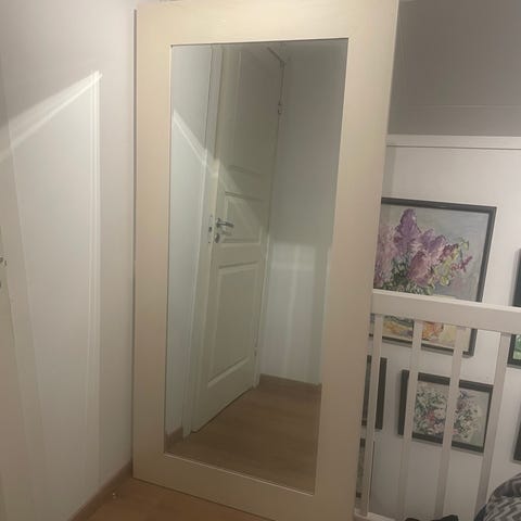 IKEA speil i hvit utførelse. Frittstående speil med rektangulær form og ramme i lys farge som passer inn i de fleste rom.