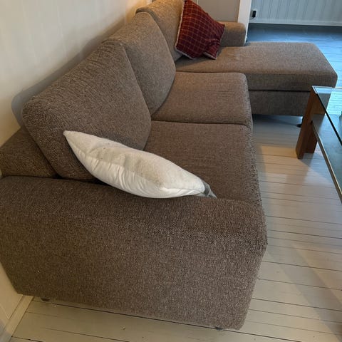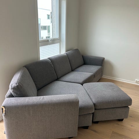 Pent brukt sofa fra IKEA, ingen merker. En sjeselong med rygglene og en stor puff/fri sofadel, som kan settes sammen på ulike måter. Blir ca 250cm lang på sitt lengste. 2 puter følger med sofaen (en stor pute, en mindre). Trekket er melert grått (en spesialkolleksjon som er utgått). Trekket kan tas av og vaskes.