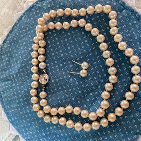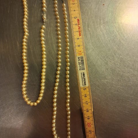 Perlekjede med runde, hvite perler tredd i jevn rekke. Kjedet har en dekorert, sølvfarget lås med sikkerhetsmekanisme. Passer som klassisk smykke til ulike antrekk og anledninger. Lengde og perlestørrelse er ikke oppgitt. Lengde 46 cm