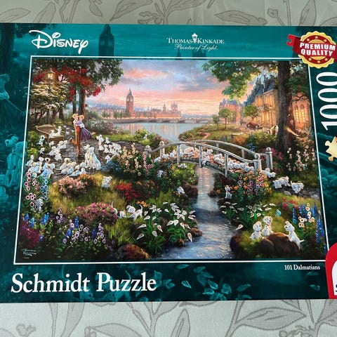 Schmidt Thomas Kinkade puslespill med motiv av en middelhavsby ved sjøen. Bildet viser en pittoresk gate med kafe, blomster og sjøutsikt i bakgrunnen. Puslespillet leveres i eske med oversiktsbilde av motivet på forsiden og flere andre tilgjengelige motiver fra samme serie på baksiden. Egnet for voksne og eldre barn som liker detaljrike landskapsmotiver.