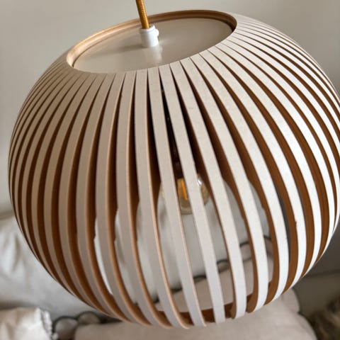 Pendelen beskrives best som kompakt, men sofistikert – et uttrykk som kommer tydelig frem gjennom de karakteristiske trespilene og den varme materialiteten.