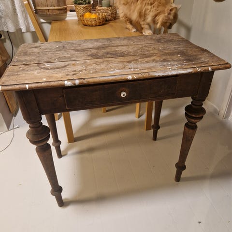 Koselig og rustikt, gammelt bord i heltre med skuff og klaff på begge sider. Bordet har en flott, naturlig patina og synlige spor av bruk som gir det masse sjarm og karakter.