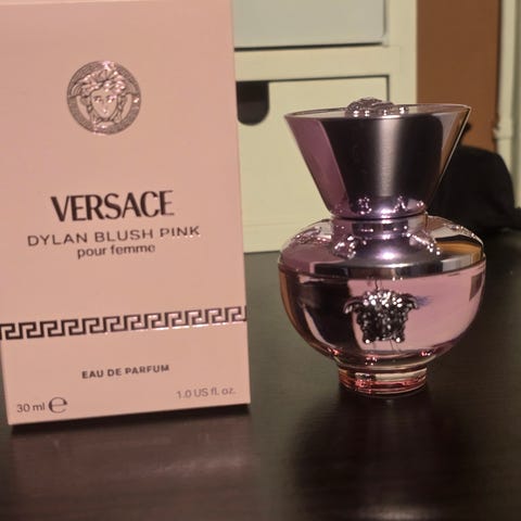 Versace Bright Crystal parfyme med rosa innhold i transparent glassflakong med fasettert, gjennomsiktig kork. Passer som duft til daglig bruk eller ved spesielle anledninger. Flasken har et klassisk rektangulært design med tydelig Versace-logo og navnet Bright Crystal på fronten.