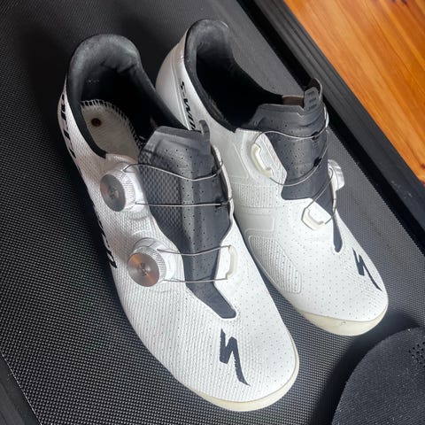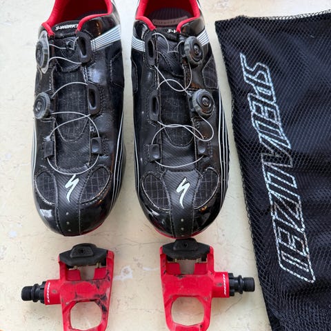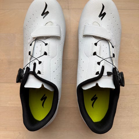 Specialized sykkelsko for landevei i størrelse 44. Skoene er svarte med BOA-snøring kombinert med borrelåsstropp over vristen for justerbar passform. Overdelen har perforeringer for ventilasjon. Sålen er stiv og tilpasset landeveispedaler med tre-bolts cleats, som vist på bildene. Egnet for bruk med landeveissykler der det benyttes klikkpedaler av denne typen.