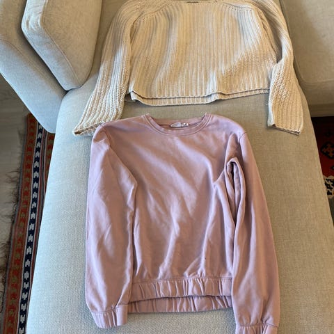 Pent brukt strikka vest m/ genser. Det er noen små flekker på genseren både foran (se bilde) og noen små nederst på ermet. Vesten er grå, genseren er hvit. Sitter ikke sammen, så kan brukes hver for seg.