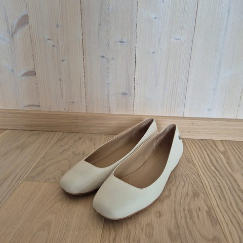 H&M ballerinasko i størrelse 39. Skoene er flate og har avrundet, lett spiss tå med rynkedetaljer foran. Fargen er brun/nøytral, og overdelen ser ut til å være i syntetisk materiale. Passer til hverdagsbruk og innendørs bruk, for eksempel på jobb, skole eller til enkle antrekk.