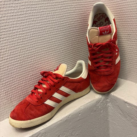 Adidas Gazelle sneakers i størrelse 38. Modellen har overdel i semsket skinn og tekstil i beige med mørkebrune detaljer og klassiske Adidas-striper. Tykk, brun gummisåle med preget Adidas-logo. Lissemodell med polstret pløse og hælparti for økt komfort. Passer som fritidssko og hverdagsbruk.