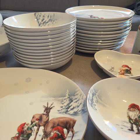 Nissens jul, utgått serie fra Firkløveren. 4 stykk middagstallerker, 4 stykk tefat og 4 stykk kopper. 2000 eller bud for alt.