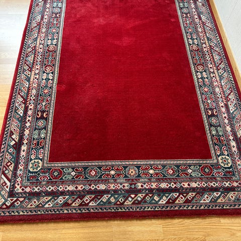 I motsetning til mer blomstrete mønstre, har dette teppet en mer "stram" og geometrisk stil. Dette gjør at det passer vel så godt inn i et minimalistisk nordisk hjem som i et mer klassisk interiør. Fargepaletten i dyp rød og rolig indigo-blå gir rommet karakter og en lun atmosfære.