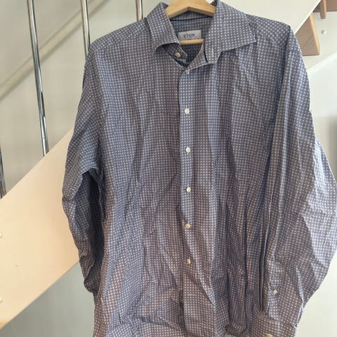 Eton skjorte for herre i størrelse 46. Skjorten er i blått rutemønster og er laget av bomull. Klassisk modell med krage og lange ermer, knappelukking foran og mansjetter med knapper.