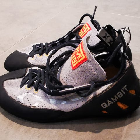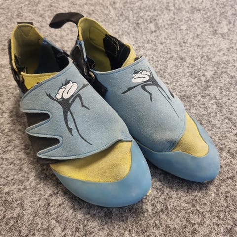 Brukt, men mye såle igjen. En god allroundsko med flat såle, noe som gjør den behagelig å bruke over tid - optimalt for nye klatrere. Egner seg til bruk på klatrevegg og buldring.